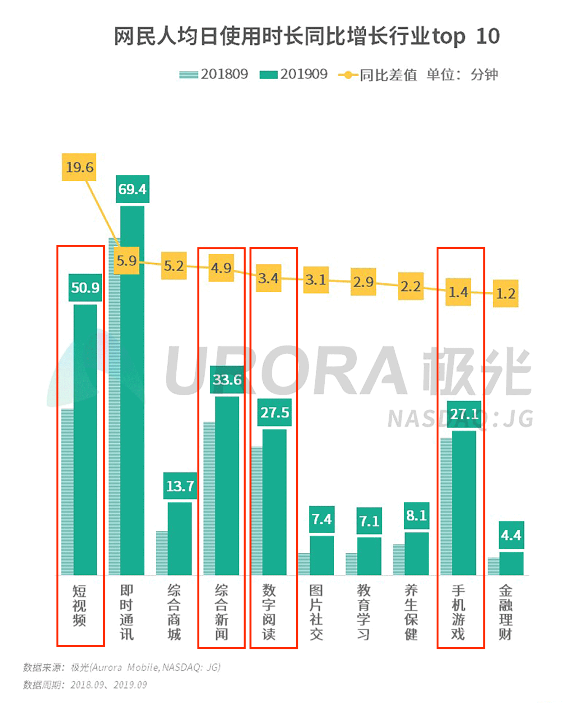 (增长最快的几个——好吧我不喜欢这个词——赛道。红线框出的的趣头条布局的赛道。来源:极光数据)