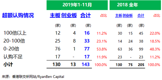 四、香港IPO上市超额认购情况 (2019年前十一个月)