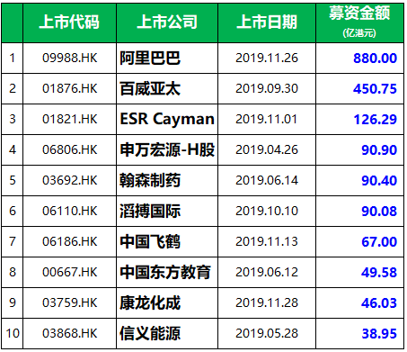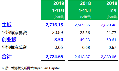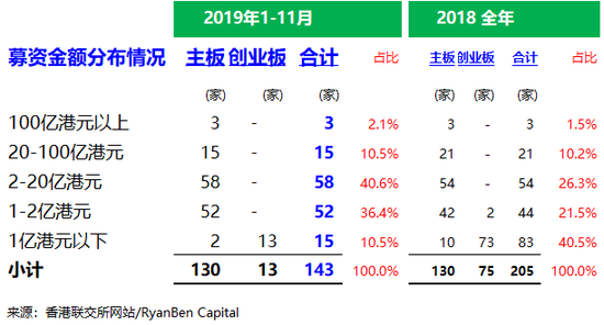 2019年前十一个月,通过IPO上市的 143 家上市公司 (创业板转主板的 13 家、通过介绍上市的 2 家,不涉及募资,不包括在内)一共募资 2,724.65亿港元,较上年同期的募资增加 4.0%,主要在于2019年前十一个月有 3 家募资金额超过100亿港元的超大型 IPO项目(阿里巴巴、百威亚太、ESR),其中阿里巴巴的IPO募资高达880亿港元。