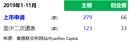 2019年前十一个月,一共有 345 家企业递交上市申请,其中主板 279 家、创业板 66 家;其中至少是第二次递表的,主板、创业板分别有 123 家、33 家。
