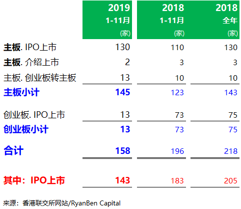2019年前十一个月,在香港挂牌上市公司的一共有 158 家,较上年同期的196 家减少了 38 家,同比减少 19.4%,主要在于创业板 (GEM) 上市的数量减少 60 家所致。而主板的上市数量不但没有减少,反而比上年同期增加了 22 家 ,同时依然还是自1994年以来表现最好的 ( 2019年前三季,香港主板上市100家,是自1994年以来同期上市数量最多的)