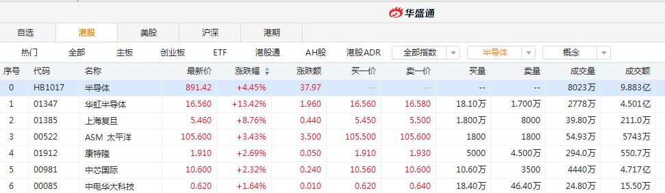 截至发稿,华虹半导体(01347)涨13.42%,报16.56港元;上海复旦(01385)涨8.76%,报5.46港元;ASM太平洋(00522)涨3.43%,报105.6港元;康特隆(01912)涨2.69%,报1.91港元。