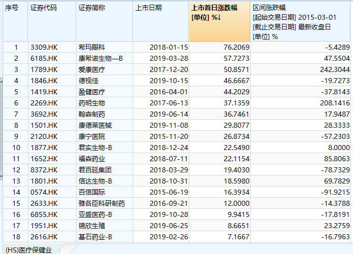 从2015年3月11日春立医疗上市开始,以港交所的医疗保健行业分类,剔除(医汇集团、卓咖控股、德斯控股、REPUBLIC HU、亮晴控股、HEKHOLDINGS)。医疗保健行业上市56家公司,22家公司首日破发,平安好医生,歌礼制药等6只个股收平,28家公司首日上涨。