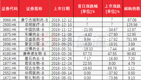 认购倍数较高的未盈利生物制药公司如亚盛医药-B,康希诺生物-B都表现非常好。最近招股的启明医疗-B与康宁杰瑞-B认购倍数极高。如果往常的惯例有效的话,他们有可能也会有不错的首日涨幅。