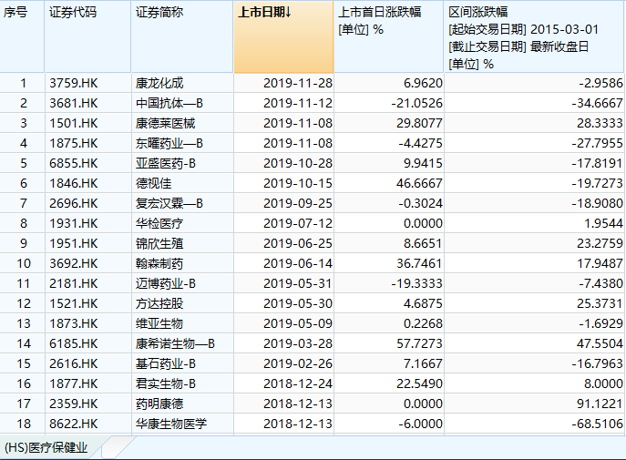 从2015年3月11日春立医疗上市开始,以港交所的医疗保健行业分类,剔除(医汇集团、卓咖控股、德斯控股、REPUBLIC HU、亮晴控股、HEKHOLDINGS)。医疗保健行业上市56家公司,22家公司首日破发,平安好医生,歌礼制药等6只个股收平,28家公司首日上涨。