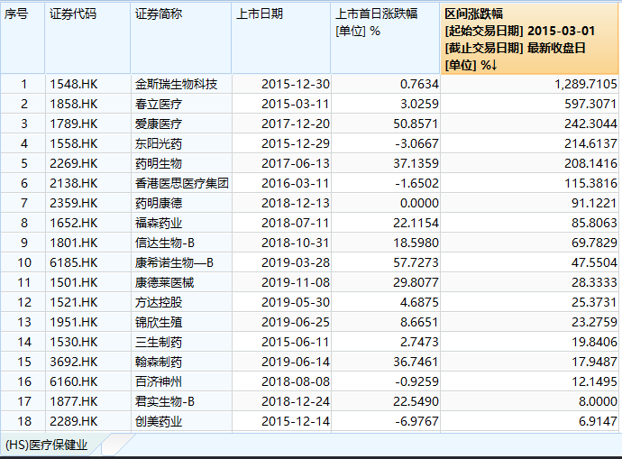 从春立医疗以来的上市医药企业,涨幅最高的是金斯瑞生物科技,涨幅为1289.7%,跌幅最大的为百信国际,下跌91.92%。