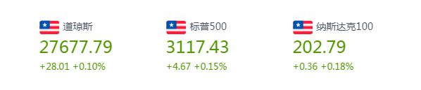 道指周四收盘上涨28.01点,涨幅为0.1%,报收于27677.79点;标普500指数涨4.67点,涨幅为0.15%,报收于3117.43点;纳指涨4.03点,涨幅为0.05%,报收于8570.70点。
