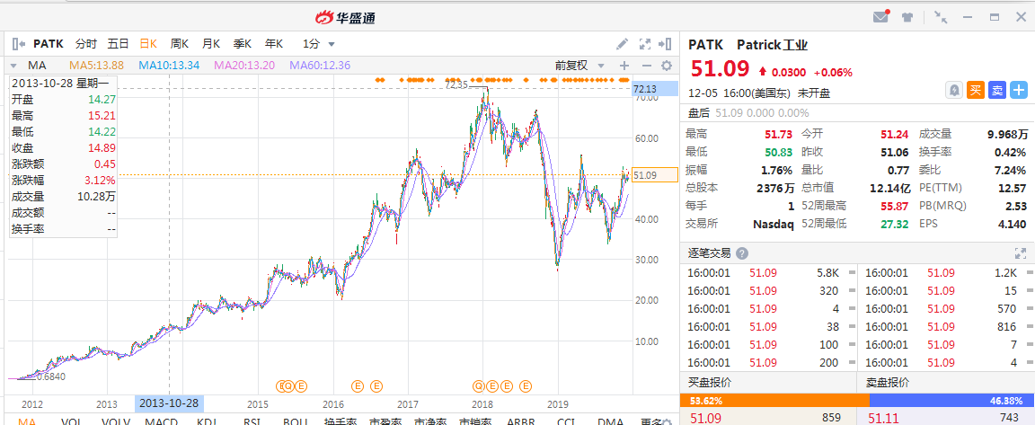 排名第一的Patrick Industries涨幅高达250多倍,公司成立于1959年,是组件产品制造商和分销商,还是一家生产建筑产品和材料休闲车和住房工业生产的公司。此外,该公司还是一家若干其他工业市场的供应商,如橱柜,家具,灯具零售及商业家具,船舶,以及其他工业产品。Patrick制造各种产品,包括装饰性的乙烯基和纸板,包裹轮廓线条,橱柜门和部件,台面,内部通道门,外部图形和墙插槽及墙插槽组件。