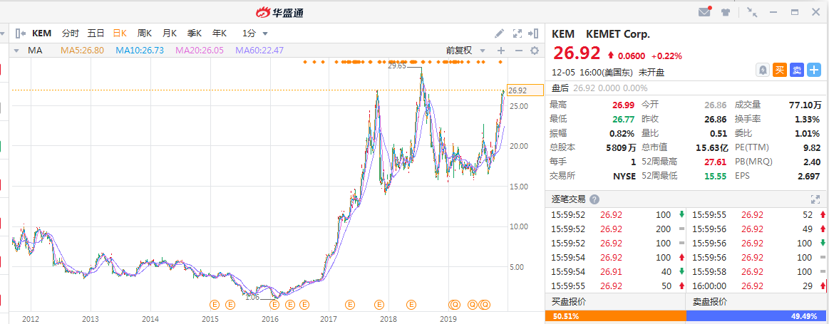 排名第四的Kemet Corp涨幅也高达110倍,是一家美国电容器制造商,例如钽、铝、多层陶瓷、薄膜、纸张、聚合物电解和超级电容器。Kemet还生产其他各种无源电子元件,如交流线路滤波器、EMI磁芯和滤波器、挠性抑制器、机电设备(继电器)、金属复合电感器、铁氧体产品以及变压器/磁性器件。