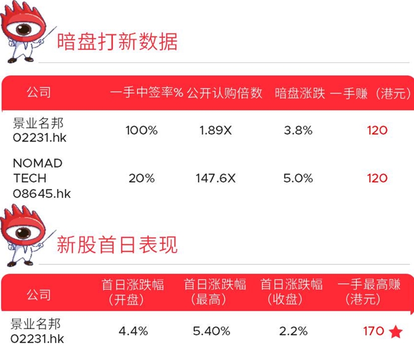 本周上市新股比起上周少了些热闹,景业名邦虽获小幅超购一人一签,但暗盘每手还是能赚120港元,首日最高涨5.4%,抓住时机卖出最高能赚170港元。