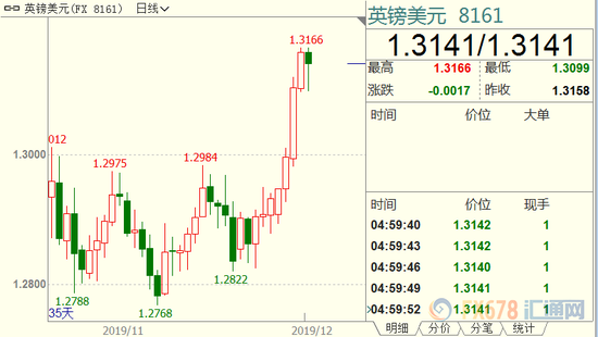 民调显示,英国执政党保守党将在12月12日大选中赢得绝对多数席位,一个强大的保守党政府可能会非常支持英国脱欧,也将会带来亟需的政治安定,这激励了英镑高歌猛进,兑美元汇率站稳1.30关口上方,盘中录得七个月高位1.3166,终盘大涨1.61%至1.3141。