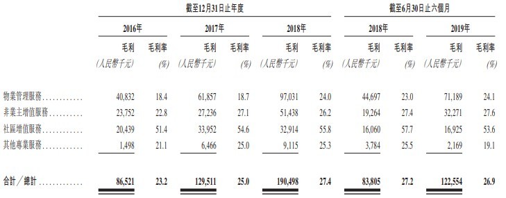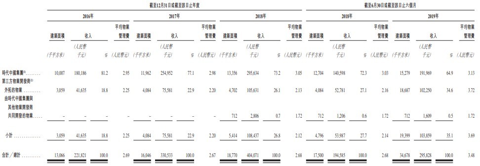 从上图可以发现,时代邻里的总收入从2016年的3.73亿元增长至2018年的6.96亿元,年复合增速为36.6%。2019年上半年增速更高,同比增长48.1%至4.56亿元。主要是在2019年3月收购广州东康,使得在管物业面积增加了1340万平方米。