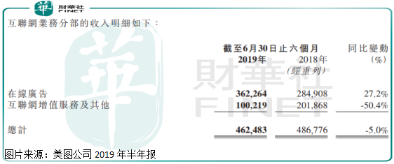 我们重点集中在互联网业务来看看,美图公司互联网业务主要包含两块,在线广告和互联网增值服务及其他。