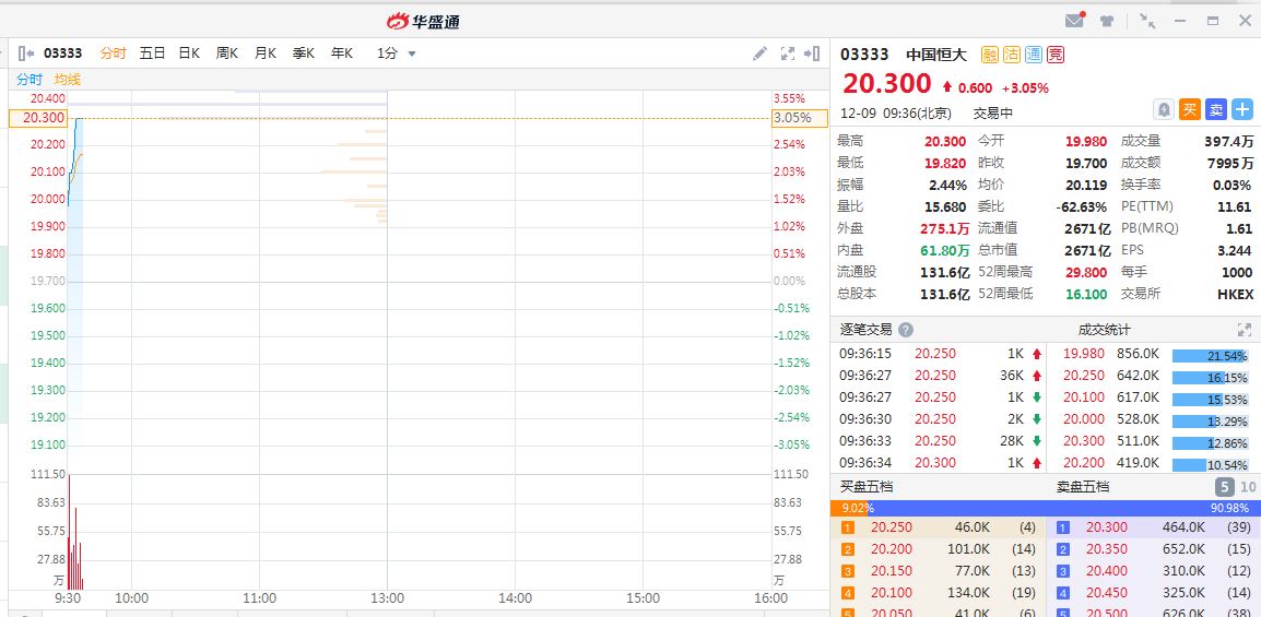 新浪港股讯 12月9日消息,此前发布公告拟派发2018财年股息每股1.419元,截至发稿,中国恒大涨3.05%,报价20.3港元。