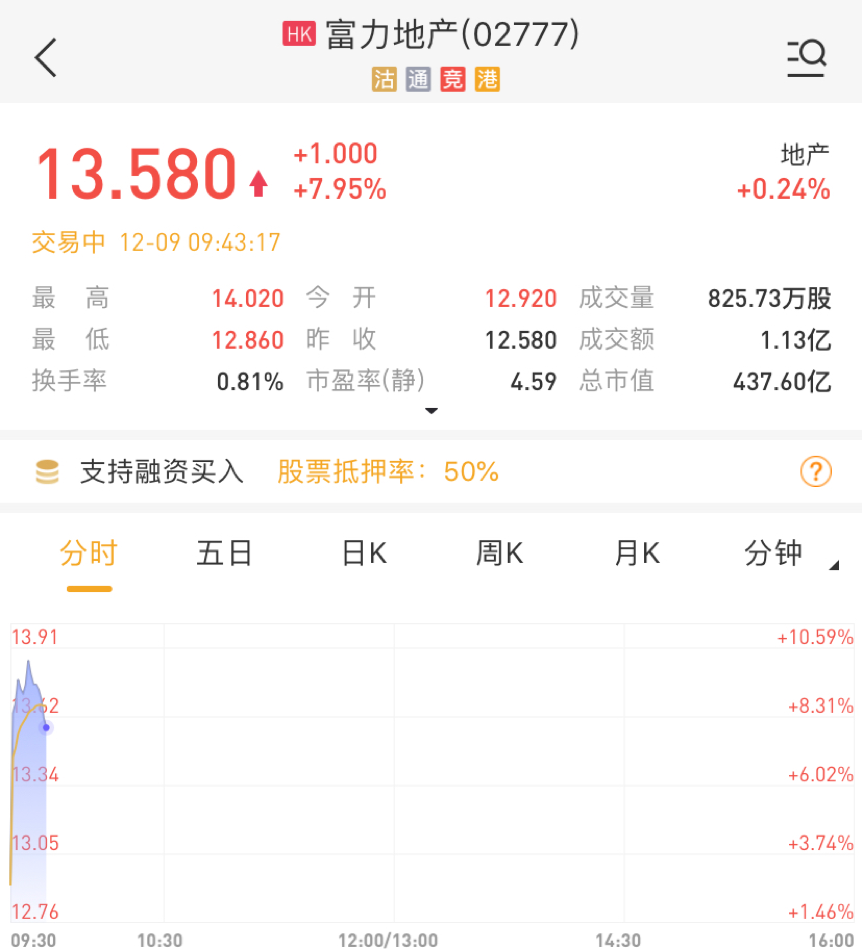 华盛资讯12月9日消息,富力地产(02777)盘中异动。截至发稿,富力地产大涨7.95%,现报13.58港元,当前成交量825.73万股,成交额1.13亿港元,换手率为0.81%。