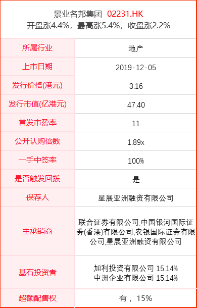 景业名邦集团中签率100%,首日收涨2.2%,最高一手赚170港元,一顿饭钱吧。虽然是今年比较热的地产股,但想象空间对比同行还是一般。