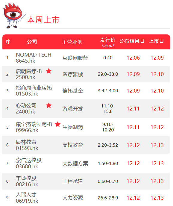 本周可就热闹了,9只新股陆续上市,启明医疗-B、心动网络、康宁杰瑞、招商房托......之前火爆认购的新股都挤在这周了,打新的朋友可要时刻关注自己的中签情况哟~