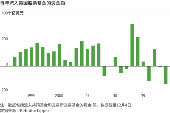 上述撤离的资金大多数从共同基金流出。据Refinitiv数据,今年以来有约2208亿美元从股票型共同基金中撤出,遭遇撤资的大部分是使用过去10年来表现不佳的主动管理型策略的基金。与此同时,有853亿美元流入了股票ETF,但这一流入规模处于八年来低点。
