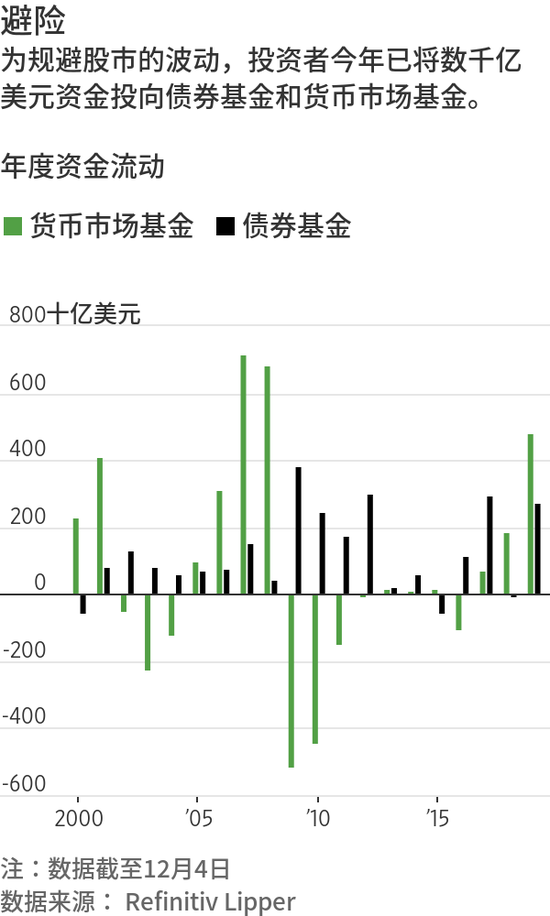 分析人士称,在贸易争端以及对经济可能陷入衰退的忧虑困扰美国股市之际,上述趋势凸显出投资者对市场的担忧。自2018年二季度以来,股票基金已经连续七个季度遭遇撤资。