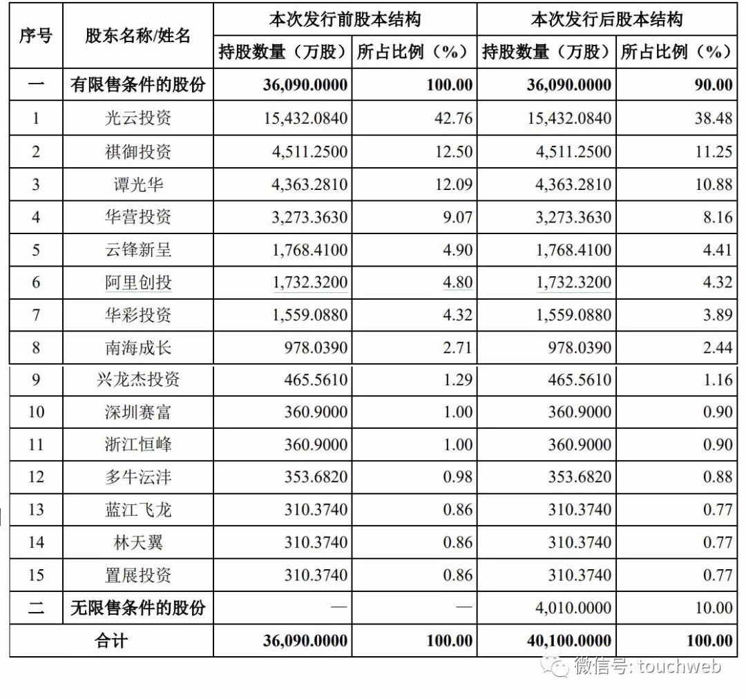 祺御投资为第二大股东,持股为12.5%,华营投资持股为9.07%,云锋新呈持股为4.9%,阿里创投持股为4.8%;