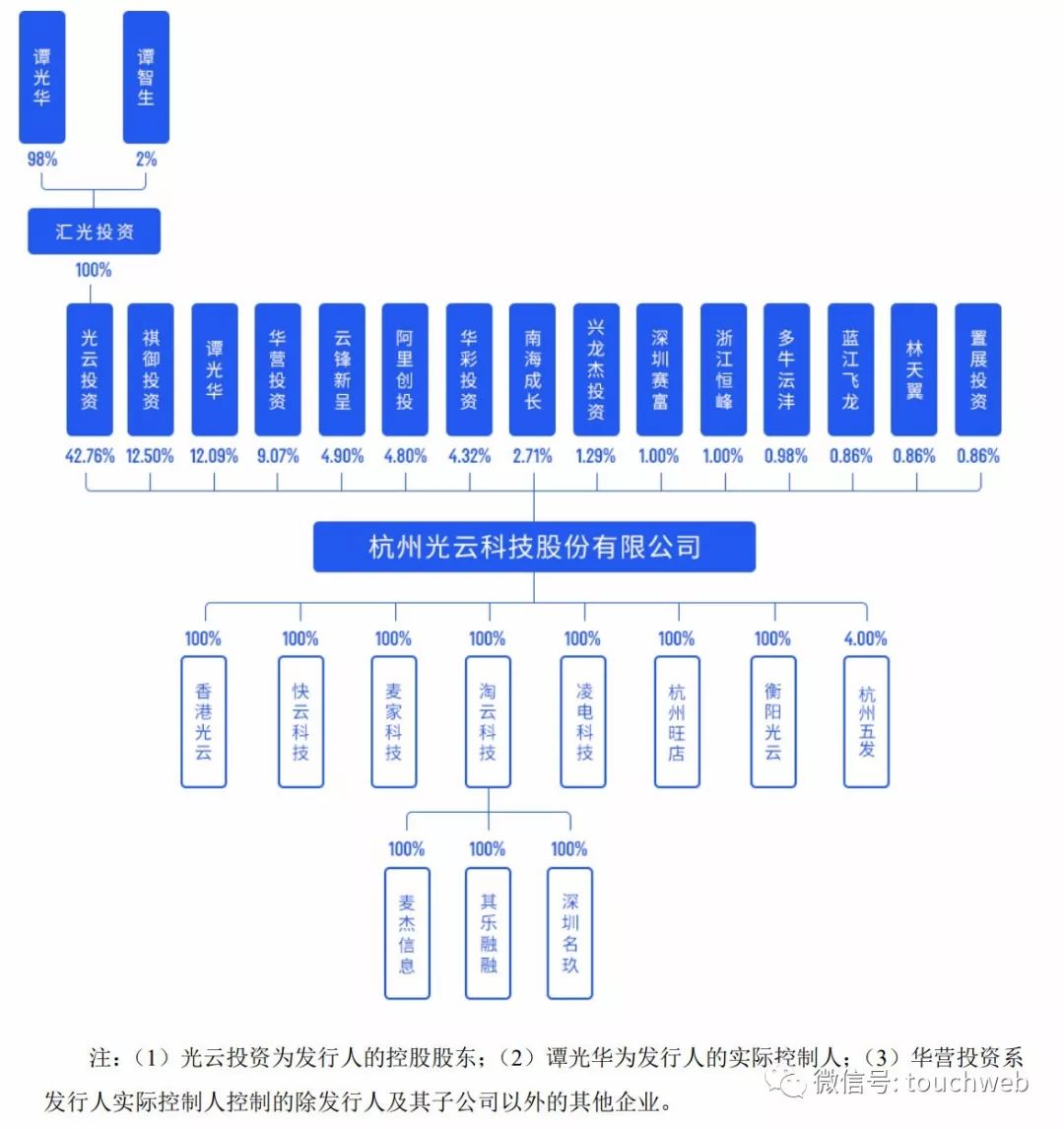 光云科技的实际控制人为自然人谭光华。谭光华通过直接及间接的方式合计控制光云科技23,068.7280万股股份,占光云科技发行前总股本的63.92%,现任光云科技董事长兼总经理。