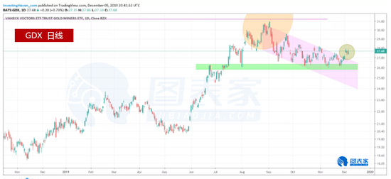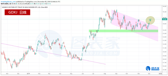 图为GDX的日线走势,价格已经在上周出现向上破位,并连续3个交易日收于通道上方。