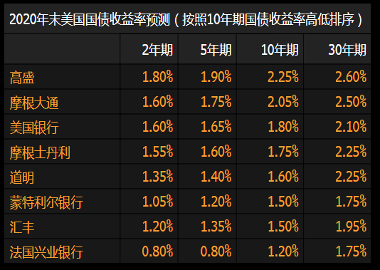法国兴业银行最看涨,预计10年期国债的收益率将从目前的约1.82%降至1.20%;蒙特利尔银行资本市场、汇丰控股和道明证券也预计收益率下跌。在发布了2020年前景的主要银行中,高盛集团的收益率预测最高,但即便如此,也仅预测基准收益率升至2.25%;摩根大通以2.05%的预测位居次席。