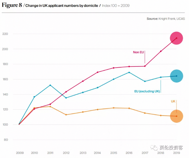 Knight Frank发布的数据显示,自从2016年脱欧公投以来,欧盟学生申请英国大学的数量稳步不前,甚至在英国大学的接受数量上出现了大幅下降。