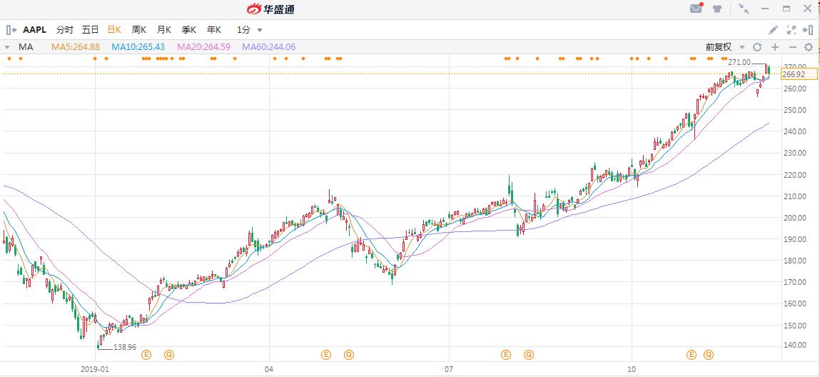 然后于1月初创出2019年新低。今年1月3日,苹果股价暴跌10%,至今年最低点——142美元,并拖累整个大盘(该股目前交易在270美元左右)。此前一天(1月2日),苹果首席执行官蒂姆•库克(Tim Cook)警告称中国iPhone销售放缓,并15年来首次下调营收指引,令投资者大为震惊。