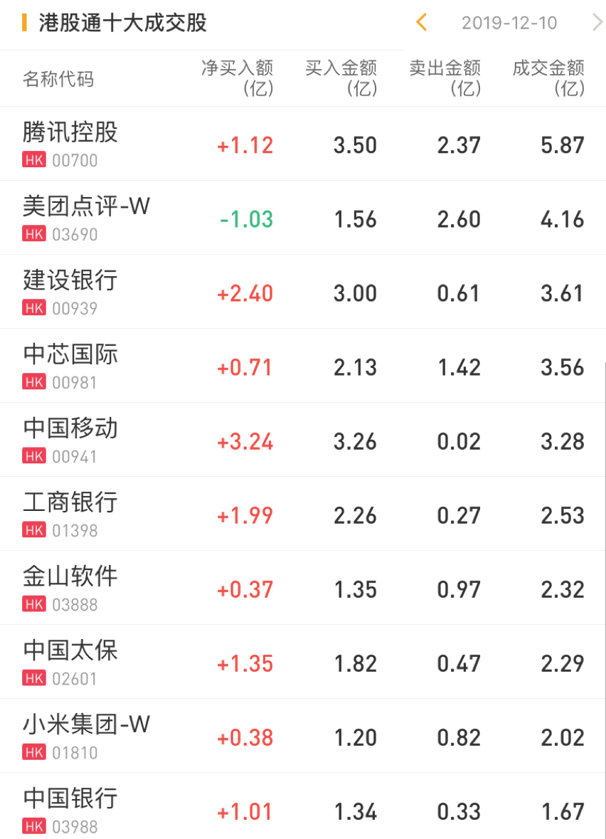 今日净买入腾讯控股1.12亿港元,净买入中国移动3.24亿港元,净买入建设银行2.40亿港元,净买入小米集团0.38亿港元;净卖出美团点评1.03亿港元。