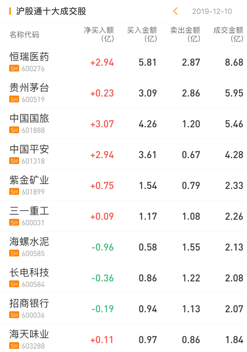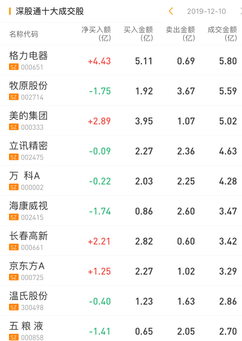 深股通净买入格力电器4.43亿元,净买入美的集团2.89亿元,净买入长春高新2.21亿元;净卖出牧原股份1.75亿元。