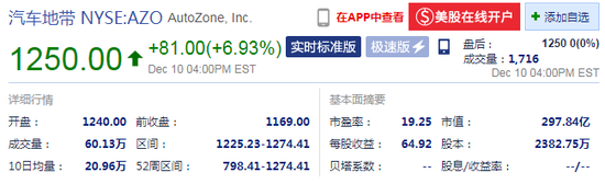 新浪美股12月11日讯,宏观对冲分析师陈凯丰表示,今天偶尔看到的一个神奇美股上市公司。做汽车配件的汽车地带公司,过去19年,股价从26美元一股上涨到1250美元一股,翻了47倍。公司业务几十年稳定没有太多变化,总盈利没有什么增长,但是每股盈利上升了36倍。