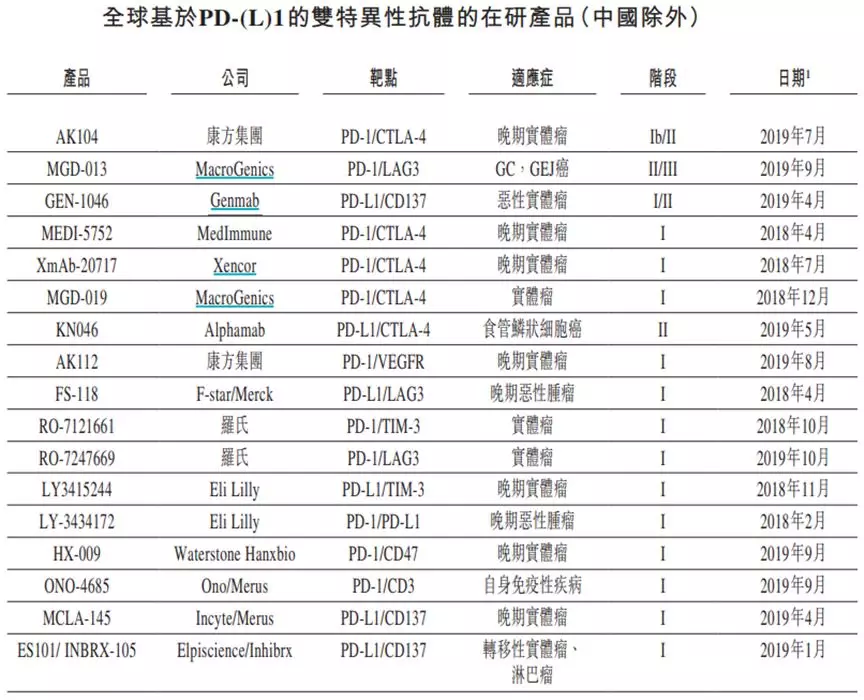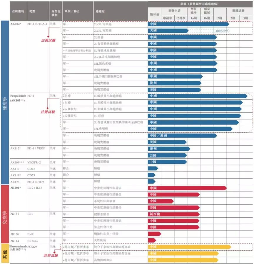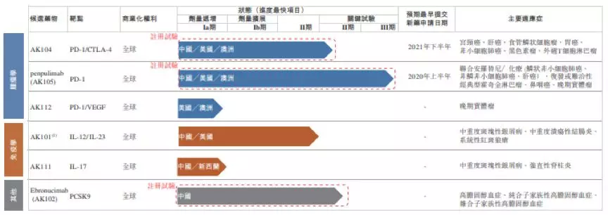 AK104属于新型的PD-1/CTLA-4双特异性抗体,主要适应症包括宫颈癌、肝癌、食管鳞状细胞瘤、胃癌等。根据资料,AK104目前处于关键试验的II期,预计最早2021年下半年提交新药申请。
