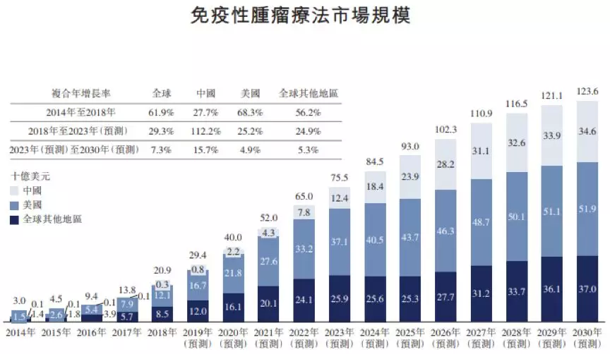 就国内市场而言,2014年至2018年中国免疫性肿瘤疗法市场处于相对初期的阶段,发展速度相对缓慢,年复合增长率为27.7%。但根据弗若斯特沙利文報告,预计2018年至2023年期间的发展速度将大大加快,年复合增长率达112.2%,市场规模将由3亿美元增长至124亿美元。