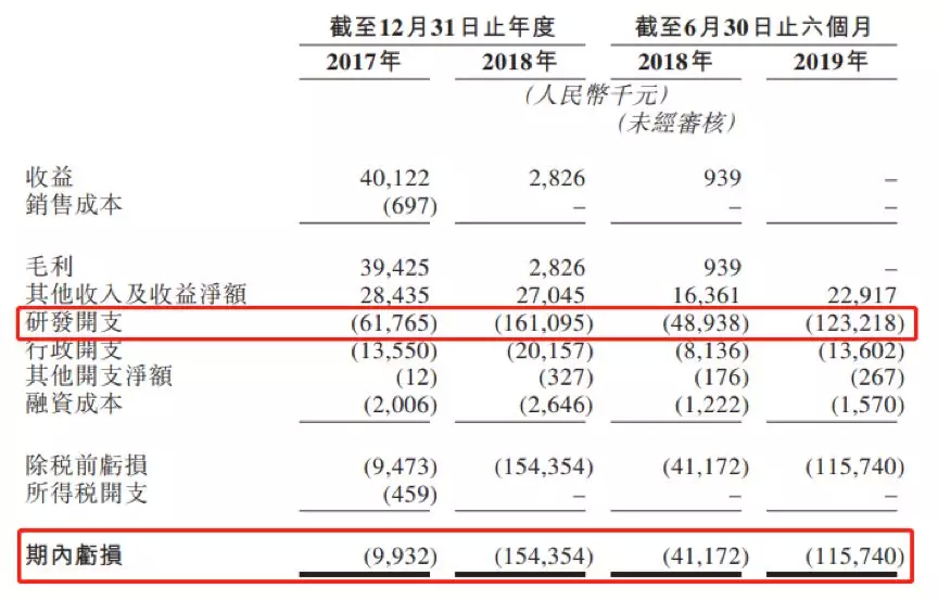 2017年和2018年,公司分别录得收入4012.2万元和282.6万元。2018上半年和2019上半年,分别录得收入93.9万元和0。该减少主要由于截至2018年6月30日止六个月收到与对外授权产品相关的预付款及里程碑付款,而于2019年并无发生。