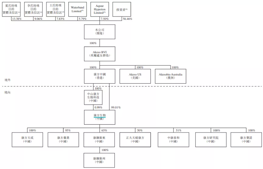 康方生物科技的控股股东为公司创始人之一的夏瑜。2019年11月,夏瑜和另外三名创始人李百勇、王忠民、张鹏连同其家族信托及控股实体订立一致行动协议,将表决权交于夏瑜,目前夏瑜合计控制康方开曼44.68%的股份,为公司的实控人。