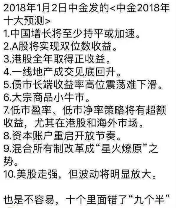 从结果上来说,中金的十大预测中,有5个半命中,和去年相比有大幅提升,不过最关键的对于A股市场和港股市场的走势依然全错。