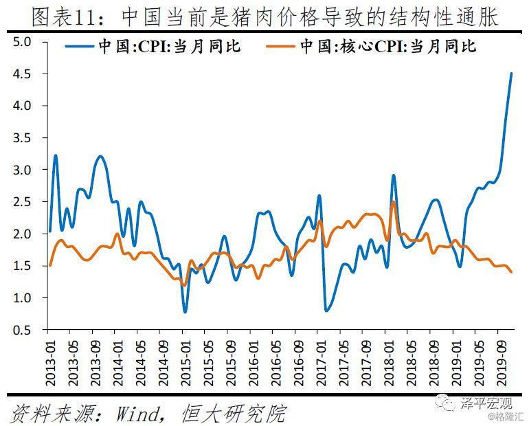 3)我们早在8月CPI同比只有2.8%时便前瞻性地预见到本轮超级猪周期对通胀的结构性冲击,旗帜鲜明地提出“拿掉猪以后都是通缩”、“不是通胀,是通缩”、“该降息了”、“不能为了一头猪牺牲整个国民经济”等观点,均被一一验证。美国1970年代的“滞胀”属于全面通胀,而当前中国的结构性通胀主要是因为非洲猪瘟和环保限产等供给侧冲击造成的猪肉价格暴涨,非食品价格、核心CPI和PPI同比增速均持续下滑。