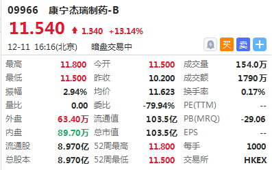 华盛资讯12月11日周三消息,今日两只新股有暗盘交易,其中康宁杰瑞制药-B暗盘高开12.74%,截止16:16,报价11.54港元,较发行价涨13.14%,成交1790万港元,最新总市值103.5亿港元。