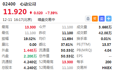 另一只新股心动公司暗盘平开,截止16:16,报价11.92港元,较发行价涨7.39%。
