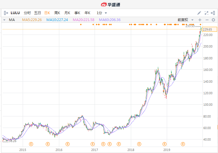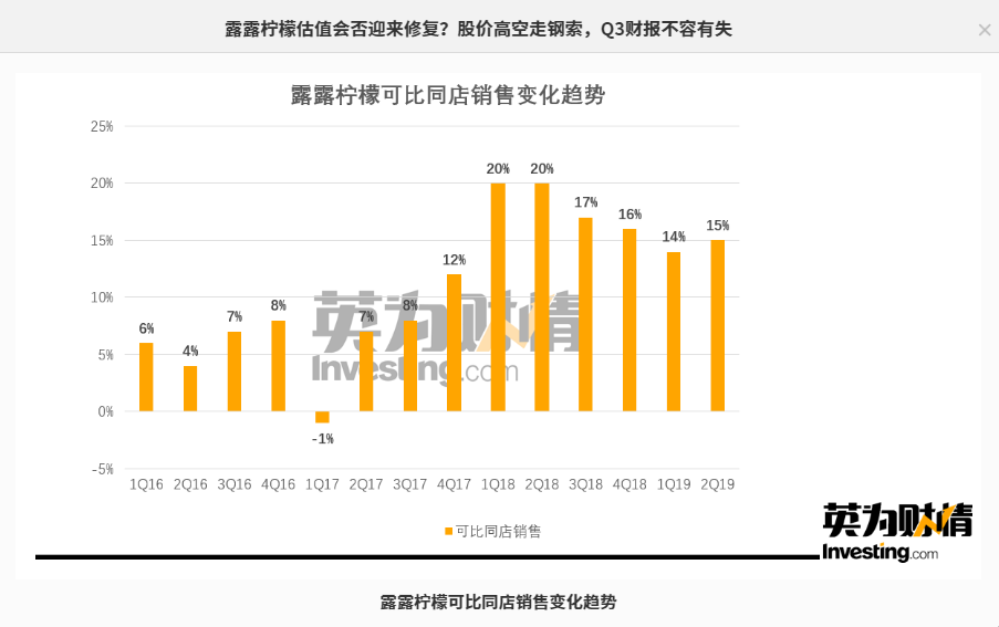 自从2018年初报告前一季度同店销售增长突破两位数以来,露露柠檬股价开始飞涨。截至目前,该公司已经连续七个季度同店销售保持在两位数的强劲水平,在此期间股价累计上涨213%。