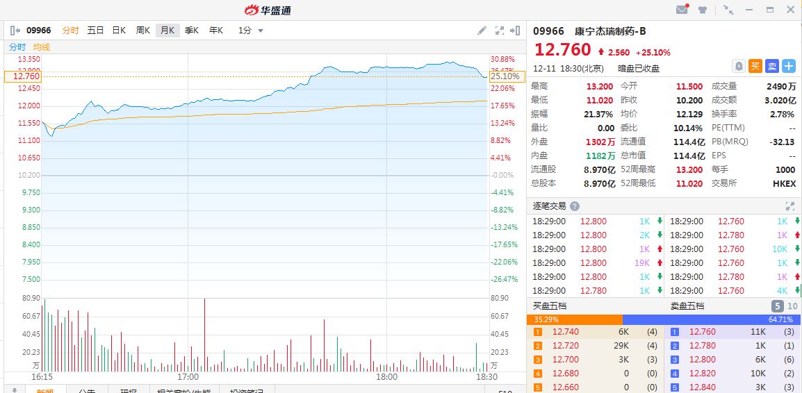 华盛资讯12月11日周三消息,今日两只新股进行暗盘交易,康宁杰瑞制药-B暗盘收涨25.10%,成交3.02亿港元,最新总市值114.4亿港元。