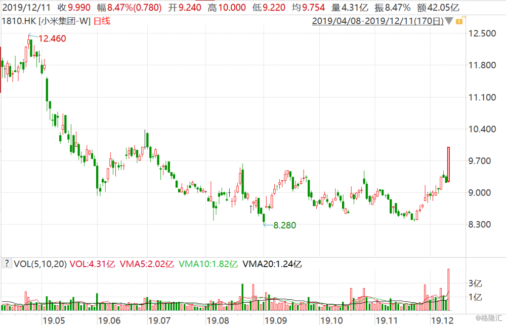 格隆汇12月11日丨小米(1810.HK)大涨8.47%,报9.99港元(发行价为17港元),成交42.05亿港元,最新总市值2400亿港元。该股股价创今年7月以来新高,8.47%的涨幅创2018年11月2日以来最大单日涨幅。