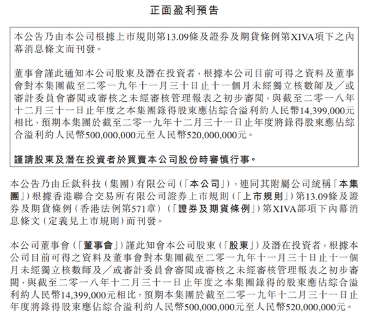 新浪港股讯 12月11日消息,丘钛科技(01478)发布公告,与截至2018年12月31日止年度集团取得的股东应占综合溢利约人民币1439.9万元相比,预期集团于截至2019年12月31日止年度将取得股东应占综合溢利约人民币5亿元至人民币5.2亿元。