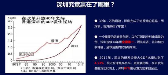所以从这一点来说,我个人认为中国还是非常有希望的。再看地区,我们说大湾区,本来说大湾区是给香港送一份蛋糕,但是香港人不要,那我们就自己发展。我们看我们生活的这个城市是多么了不起,我们深圳在过去41年改革开放当中,实际上增长了万倍,而且在2017年完成了对香港的超越,GDP超越了香港。