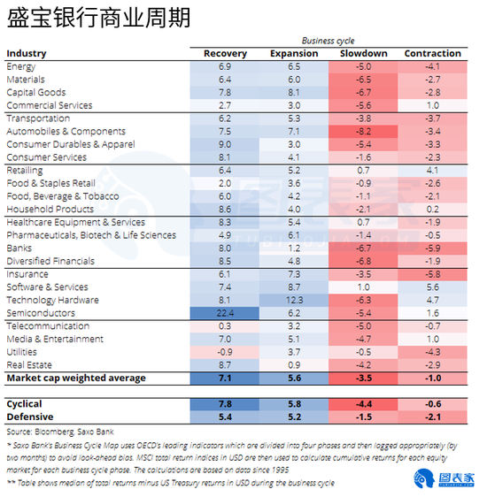 同样的分析显示,在复苏阶段最好的行业是半导体、家用产品、房地产、多元化金融、耐用消费品、服装以及医疗设备和服务。