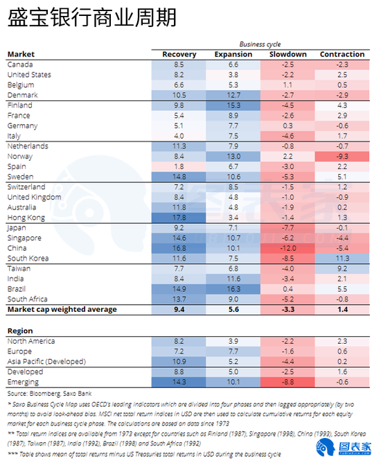 盛宝银行回溯至1973年的国家/地区经济周期图显示,如果转折点出现在10月份,那么股市将进入相对于债券而言回报率最高的时期。在每个复苏阶段,股市相对于债市的表现平均超出9.4%(以美元计价)。历史上,表现最好的股市是中国香港、中国大陆、新加坡、瑞典、巴西、南非和澳大利亚。鉴于这些市场的顺周期性,这应该不足为奇。这些市场的另一个积极方面是,它们的估值低于全球平均水平。