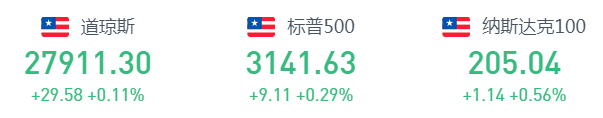 截至收盘,标普500指数涨9.10点,涨幅0.29%,报3141.62点;纳指涨37.90点,涨幅0.44%,报8654.05点;道指涨29.40点,涨幅0.11%,报27911.09点。