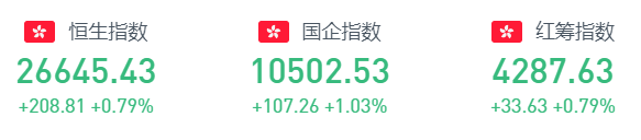 恒生指数开盘跌0.1%,全天单边上涨。截至收盘,恒生指数涨208.81点或0.79%,报26645.43点,全日成交额达743.38亿。国企指数涨1.03%,报10502.53点,红筹指数涨0.79%,报4287.63点。