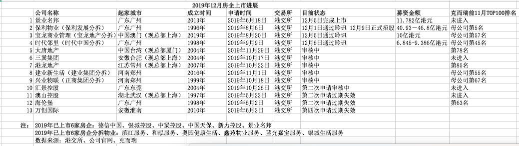 12月5日,景业名邦在港交所上市,同日宝龙地产分拆的宝龙商业管理、时代中国分拆的时代邻里物业通过聆讯,将正式招股。据《财经》新媒体记者统计,截至12月11日,今年共有6家房企、6家房企分拆物业公司在港交所挂牌,3家房企分拆公司通过聆讯,大唐地产、三巽集团等6家企业上市申请处于“审核中”,而奥山控股、万创国际、海伦堡3家房企上市申请已过期,被判定“失效”。